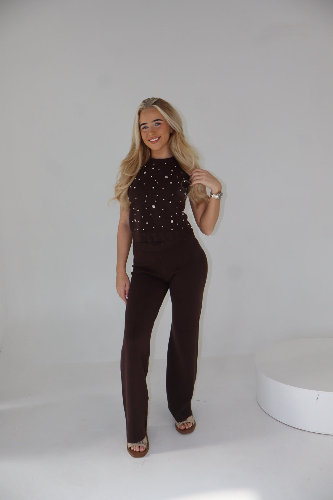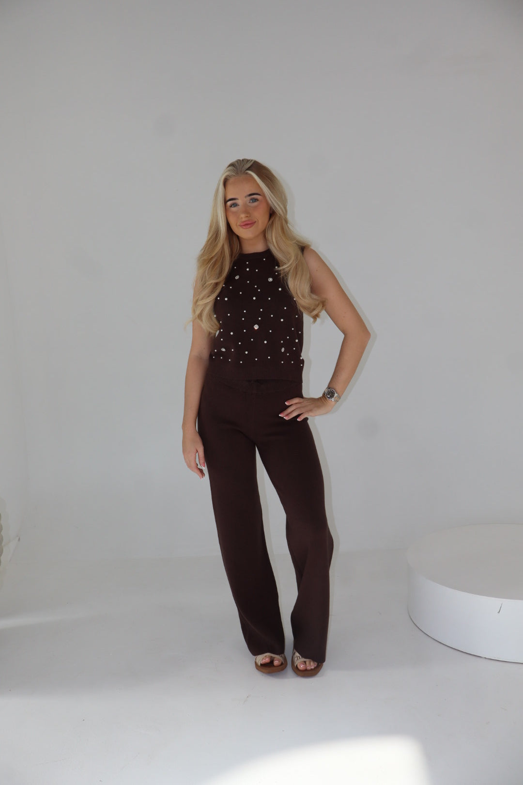 This knit co ord features an embellished vest-top, with matching straight leg bottoms.